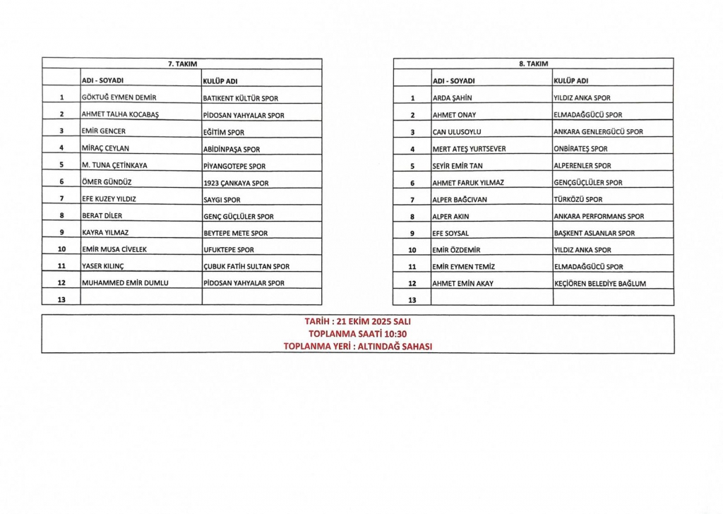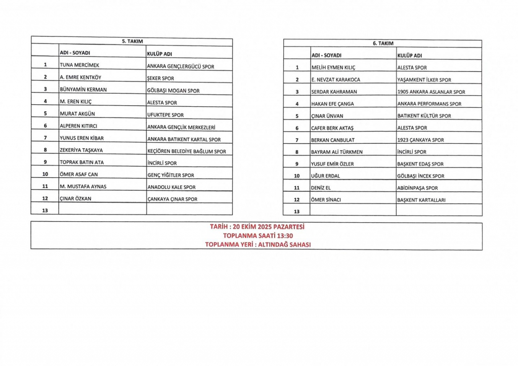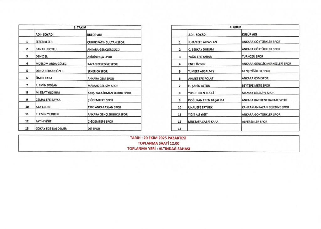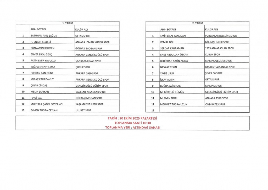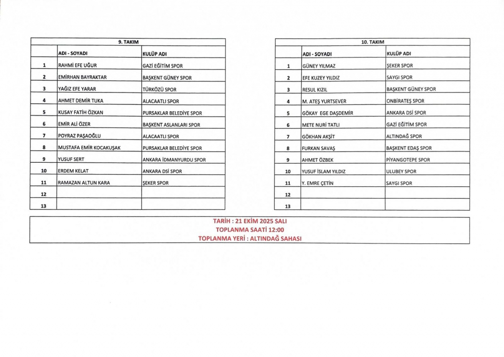 U14 milli takım seçmeler 20-10-205 ve 21-10-2025 tarihlerinde ALTINDAĞ ÖRNEK sahasında yapılacaktır. Ankara Amatör takımlarından istenilmiş olan isimler neticesinde belirlenmiş olan takımlar aşağıdaki resimlerde mevcuttur. Oyuncuların belirtilen sahada, belirtilen gün ve saatte kendi MAÇ MALZEMELERİ (tekmelik,krampon, şort vb.) ile hazır bulunmaları gerekmektedir.